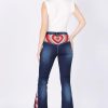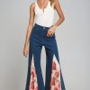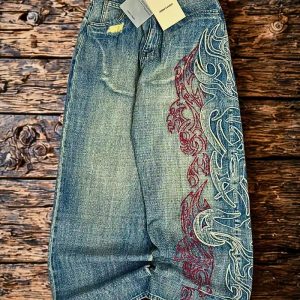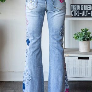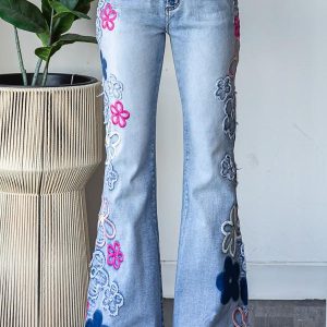 These high-waisted flare jeans feature vibrant floral embroidery in pink, blue, and white, giving off major 70s retro vibes with a modern twist. Made from light-wash denim with a flattering fit and boho-inspired details, they’re perfect for festival outfits, casual spring looks, or standout everyday style. Ideal for lovers of vintage fashion, cottagecore, and Y2K aesthetics. Style with crop tops, sandals, or boots for a playful, trend-forward look.