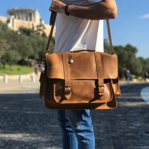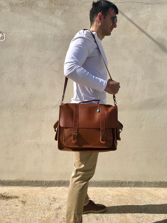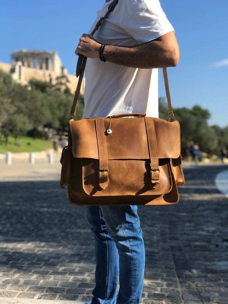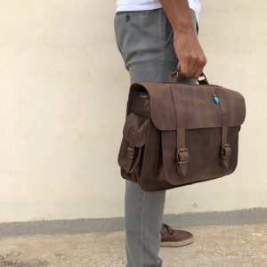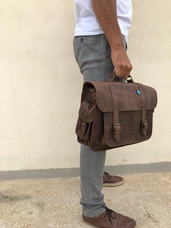This handmade dark brown leather briefcase is crafted from full grain leather, designed to carry up to a 17 laptop. Functional, durable, and timeless ideal for work, travel, or business meetings. A sophisticated leather messenger bag for the modern professional.