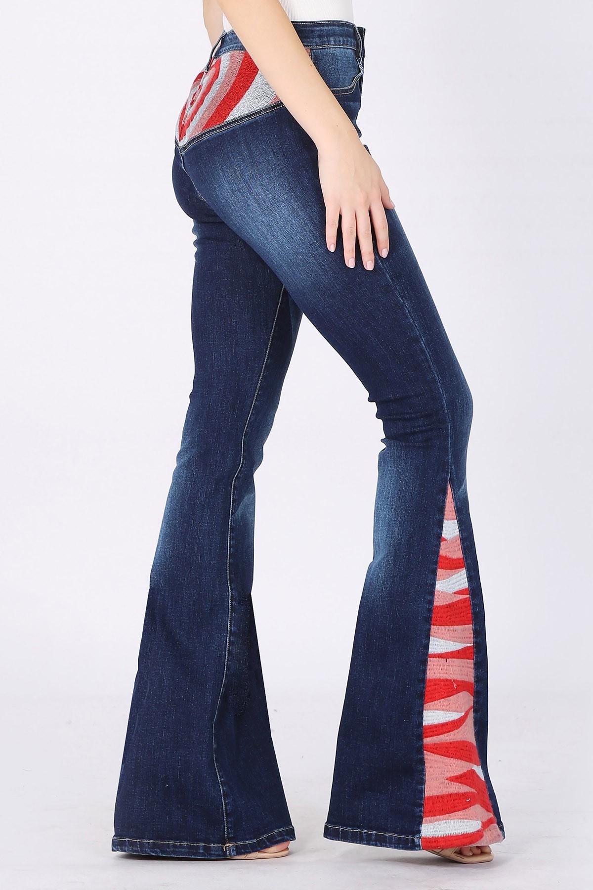 Turn heads and steal hearts in these ultra-flattering Heart Embroidered Bell Bottom Jeans perfect for valentines day, or any day. Crafted from soft, stretchy denim that hugs your curves in all the right places, these high-waisted jeans feature a bold 34″ inseam and dramatic flared legs with vibrant red and white striped inserts. The standout detail? A heart-shaped embroidered panel at the waistband and matching accents on the lower legs and back pockets—adding a playful, retro twist to a classic silhouette. Whether you’re styling them with a cropped tee or layering with a cozy knit, these jeans bring personality, comfort, and serious statement energy to any outfit.