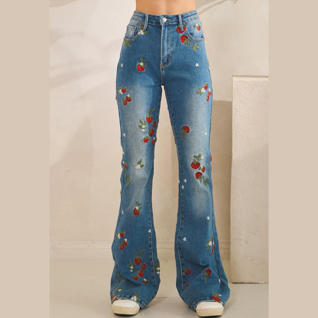 High-waisted flare jeans featuring playful strawberry embroidery and delicate white florals. Crafted from soft, vintage-wash denim with a flattering silhouette that hugs the waist and flares at the hem. Finished with subtle fading at the thighs for a worn-in, retro vibe. Perfect for styling with crop tops, sneakers, or boots.