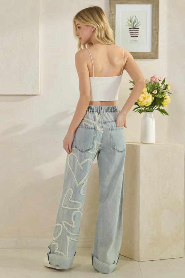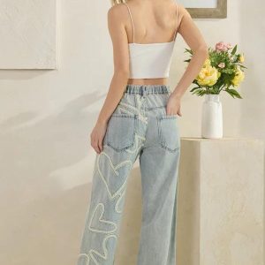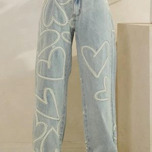 These patchwork jeans are not just everyday jeans; they are statement jeans for a bold look. Featuring a comfortable relaxed fit jeans cut, they embody the streetwear jeans aesthetic with their exaggerated wide-leg jeans silhouette, also suitable as wide leg pants. The patchwork jeans style is reimagined here with large, light-colored heart patchwork applied throughout the denim, offering a unique and artistic pattern. This design makes them incredibly unique jeans and a must-have for those looking for fashion jeans. They are a truly cute jeans option, delivering a comfortable, loose fit jeans and baggy denim look perfect for making a stylish impression.